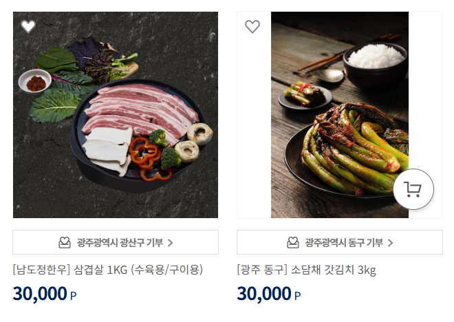 광주 광산구 기부 물품인 삼겹살 1키로와 광주의 갓김치입니다. 전라도 지역은 음식이 맛있기로 유명한 곳이라 이런 반찬류를 사보시는 것도 좋은 선택일 것 같습니다.