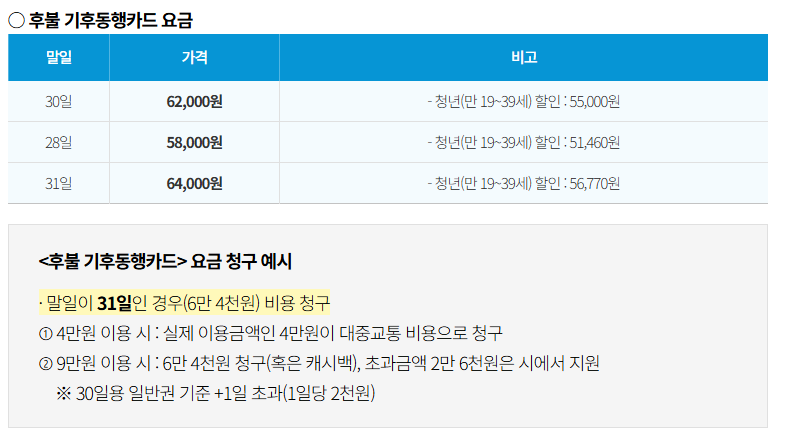 후불교통카드의 등장은 매우 편리해 보입니다. 매번 충전 금액을 신경써야 하는 불편함이 없어지고 이용자의 교통 요금 금액에 따라 자동 정산이 되므로 무척 편리합니다. 또한 일정 금액 이상 말일까지 이용한 경우 무제한 대중교통 할인 혜택이 적용되므로 더욱 편리합니다. 아래는 후불기후동행카드의 요금입니다.