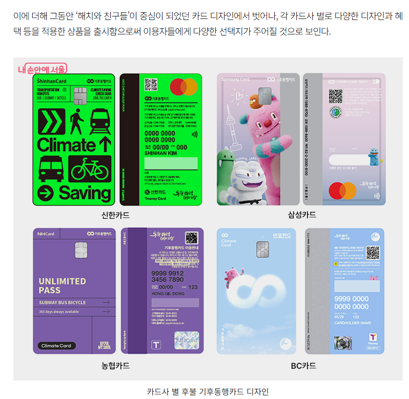 후불 기후동행카드는 MZ세대들의 독특한 감성까지 잡았습니다. 해치 시리즈의 카드 디자인에서 벗어나 카드사별로 다양하고 독특한 카드 디자인을 써볼 수 있습니다. 개인적으로는 BC카드의 기후동행카드 디자인이 굉장히 심플하고 예뻐보인다고 생각합니다.