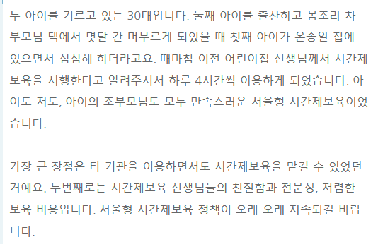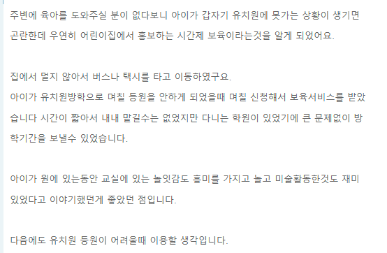 아래는 이용 수기입니다. 어린이집이나 유치원에 못 가는 긴급 상황에서 어린이집 시간제 돌봄을 이용하여 상황을 해결했다는 부모들의 진정어린 수기가 있습니다. 타 기관을 이용하는 어린이라고 하더라도 시간제 보육을 맡길 수 있다는 유연성은 꽤 좋은 부분인 것 같습니다.