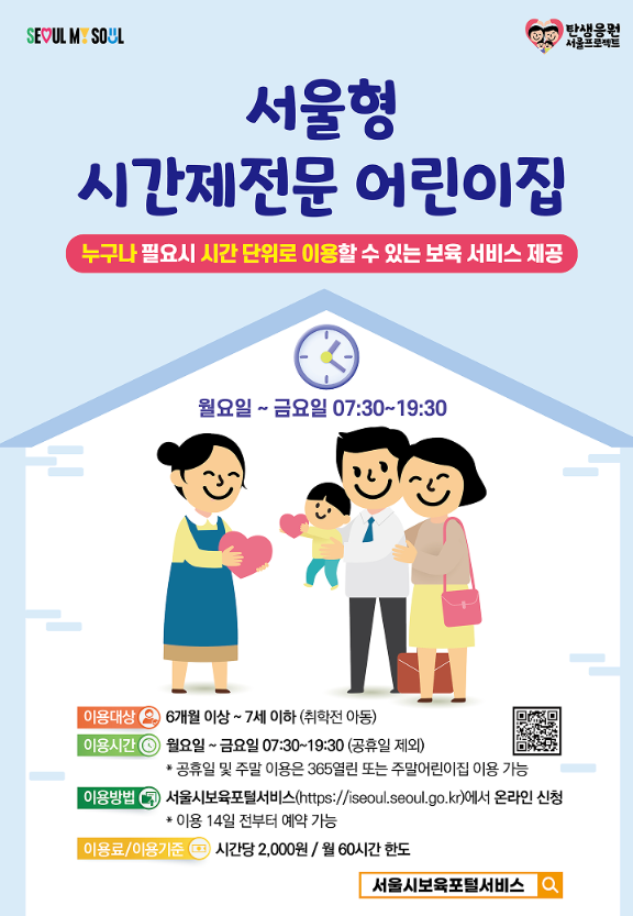 서울시는 서울형시간제전문 어린이집을 운영합니다. 맞벌이부부가 아니더라도, 누구나 필요한 경우 시간 단위로 이용할 수 있는 보육서비스를 제공하는 사업입니다. 자세한 내용은 아래와 같습니다.