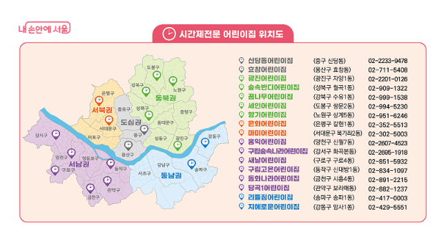 시간제 전문 서울형어린이집의 위치입니다. 기존에는 4개의 구에서 시범적으로 시행하다가 이제는 서울시 전 구의 어린이집으로 확대 중입니다. 서북권, 도심권, 동북권, 서남권, 동남권 등 권역별로 나누어서 신청이 가능하기 때문에 자신이 거주하는 지역 근처의 시간제 전문 어린이집의 위치를 잘 봐주시는 것이 좋습니다.