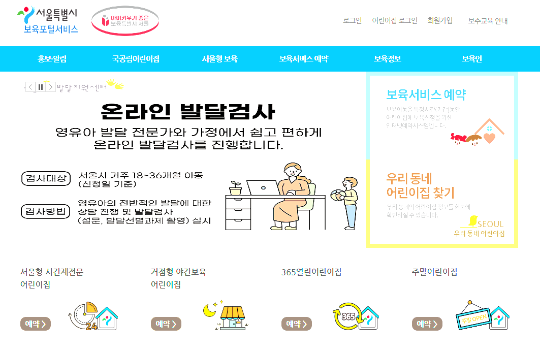 1. 사전예약 : 서울시보육포털서비스에서 회원가입 및 로그인, 아동등록 후 이용일 14일 전~1일전까지 예약 신청 가능