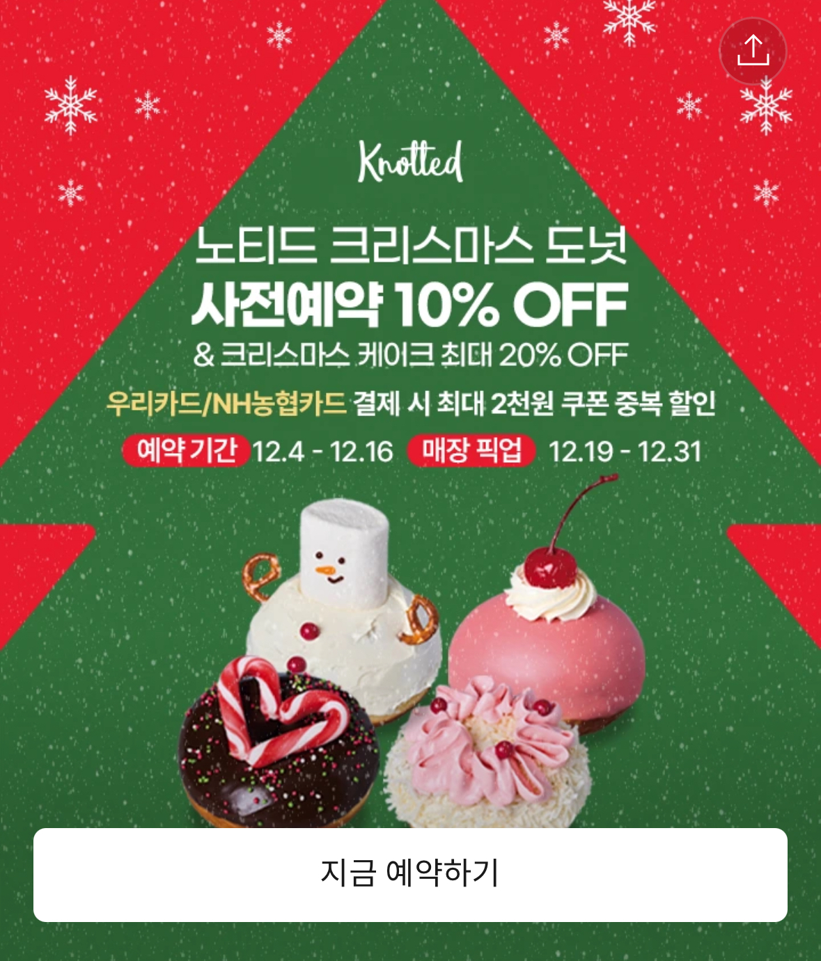 노티드에서 크리스마스 도넛 및 케이크를 사전예약 판매합니다. 도넛이나 케이크는 사전예약 시 10% 할인을 해주며 케이크 중 일부 품목에 대해서는 최대 20% 할인을 해줍니다.