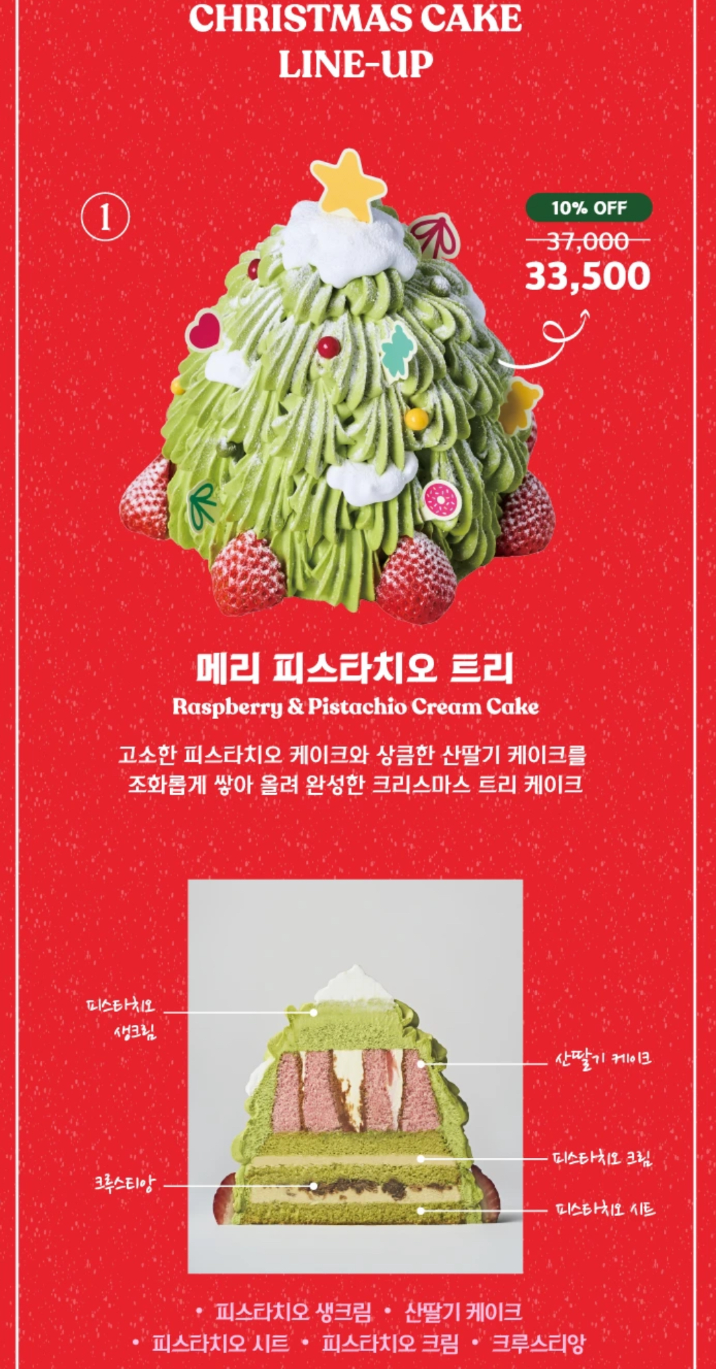 가장 인기가 많아 먼저 품절될 것으로예상되는 메리 피스타치오 트리입니다. 트리 모양에 피스타치오 크림으로 장식되어 있는 케이크인데 안에는 산딸기 케이크가 들어가 있습니다. 밑부분에는 피스타치오 시트가 들어가 있어서 제대로 피스타치오 좋아하시는 분들의 취향저격 케이크네요.