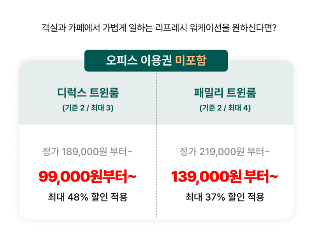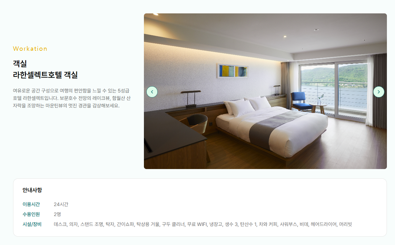 워케이션 바우처가 생소하신 분들이 있으실텐데요. 휴가지에서도 업무를 할 수 있게 워케이션 문화를 활성화하고자 지자체에서 만든 제도입니다. 라한셀렉트 기준 디럭스 트윈 1박이 88,000원부터 예약이 가능하고 인터넷 최저가보다 싸다는 장점이 있습니다.