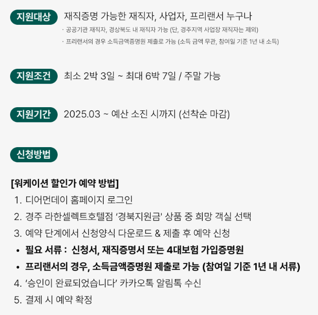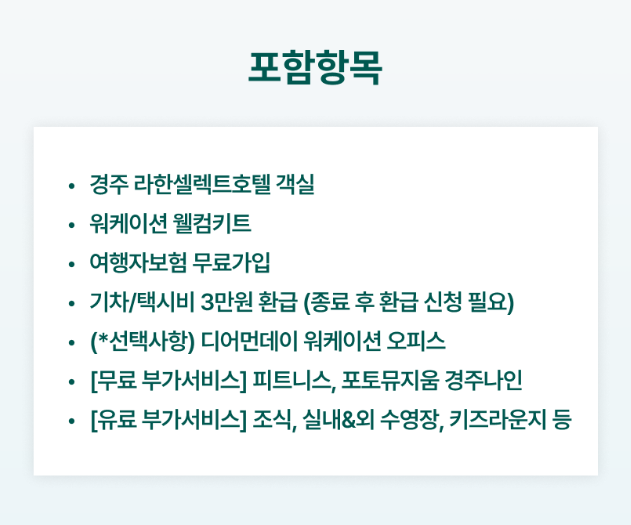 디어먼데이 워케이션에는 많은 지원금 숙소가 있습니다. 그 중에서도 저는 경주 라한셀렉트호텔점을 선택했는데요. 경주 라한셀렉트 호텔을 지원받아 1박에 8만원대(평일 기준)에 갈 수 있어서 소개드리고자 합니다. 포함되는 내용은 객실,웰컴키드, 여행자보험, 교통비 3만원 지원 및 피트니스 등입니다.