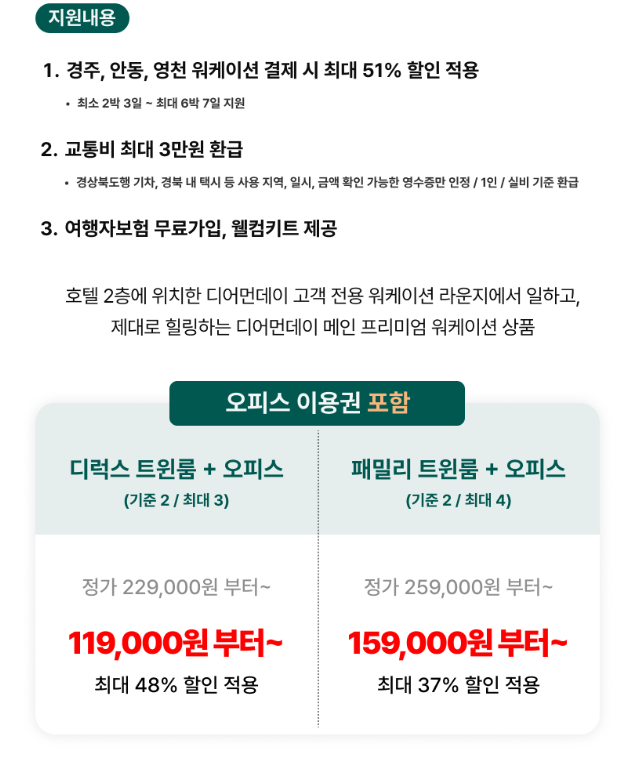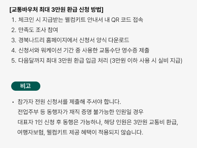 또 여행이 끝난 후 교통바우처도 받을 수 있는데 체크인 시 받는 웰컴키트 내 QR로 접속한 뒤 만족도 조사를 하고 교통수단 영수증을 제출하면 최대 3만원까지 교통비를 지원받으실 수 있습니다. 만약 실비가 3만원 이하라면 실비만 지급됨을 유의해주시기 바라니다.