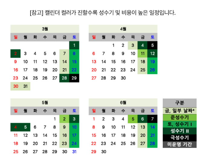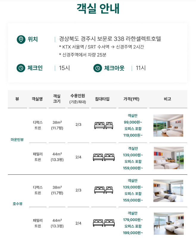객실 타입과 성수기/비수기 캘린더입니다. 색깔이 진할수록 높은 비용을 지불해야하므로 날짜를 잘 선택하시는 것이 중요합니다. 가장 추천 타입은 호수뷰 디럭스룸입니다. 2-3인이라면 호수뷰 디럭스룸으로 충분히 즐기실 수 있습니다.