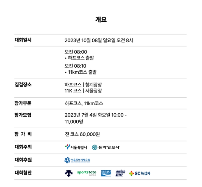 아래는 2023년 10월 8일 일요일에 개최되는 서울달리기의 포스터입니다. 오전 8시 하프코스 출발하며 오전 8시 10분 11km 코스 출발이 예정되어 있습니다. 서울특별시에서 주관하는 행사로 본 행사를 위해 서울 시내의 주요 구역이 교통 통제가 이루어질 예정입니다.