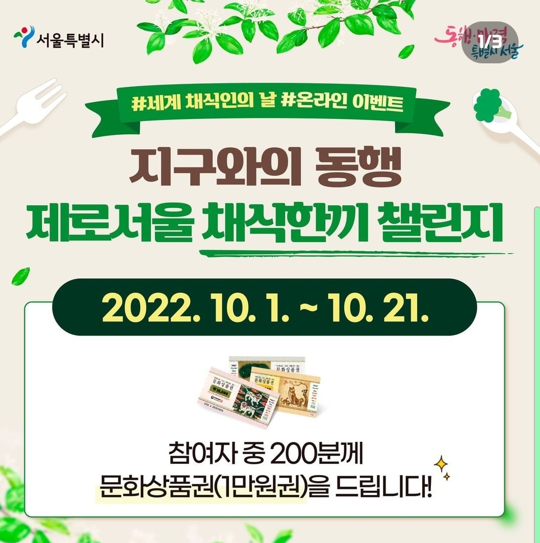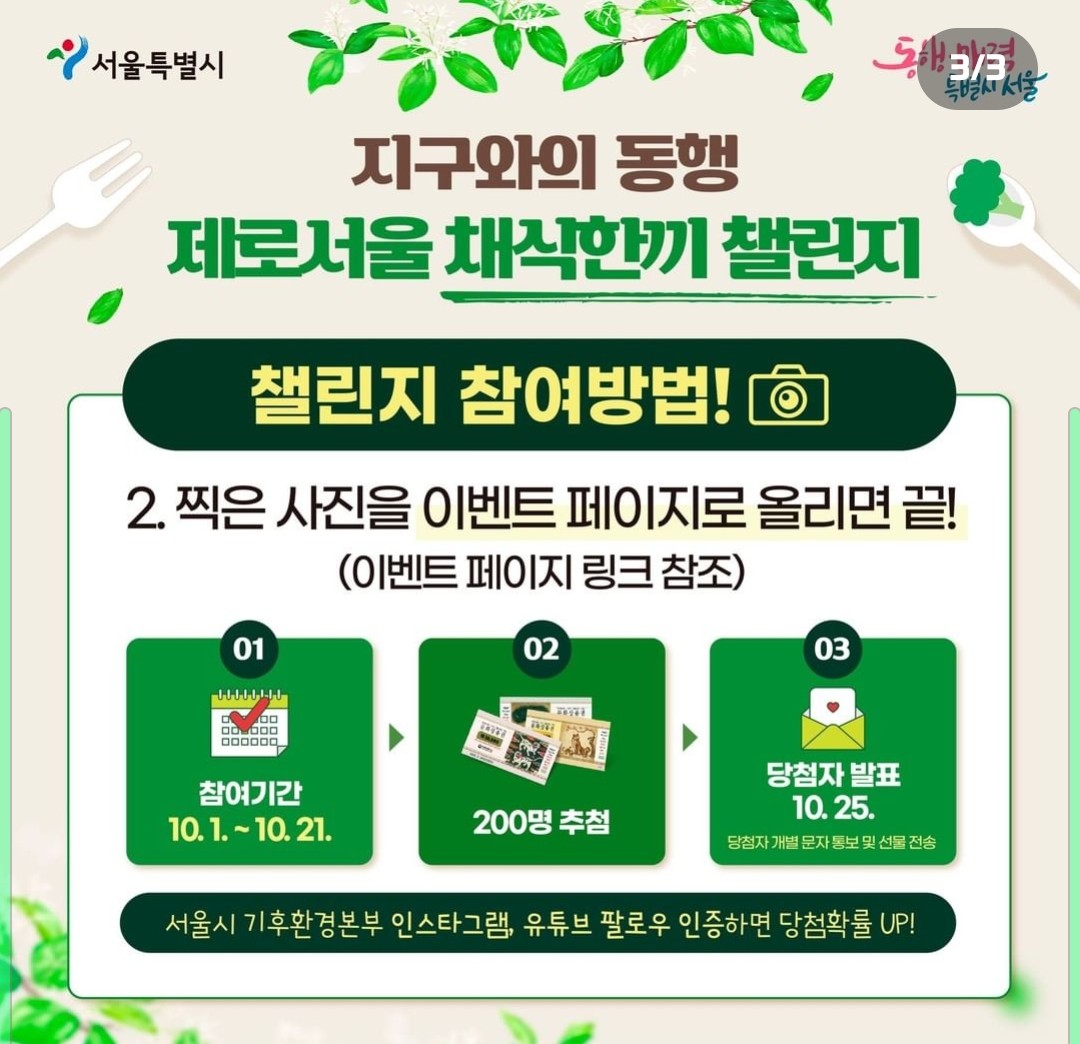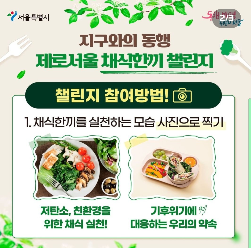 탄소중립의 중요성을 알리기 위해 서울시가 나섰습니다. 서울시 기후환경본부에서는 탄소 제로 서울에 도전하기 위해 제로서울 채식한끼 인증 챌린지를 열었습니다.(10월 21일까지)