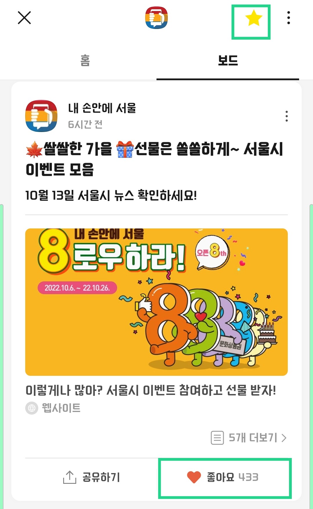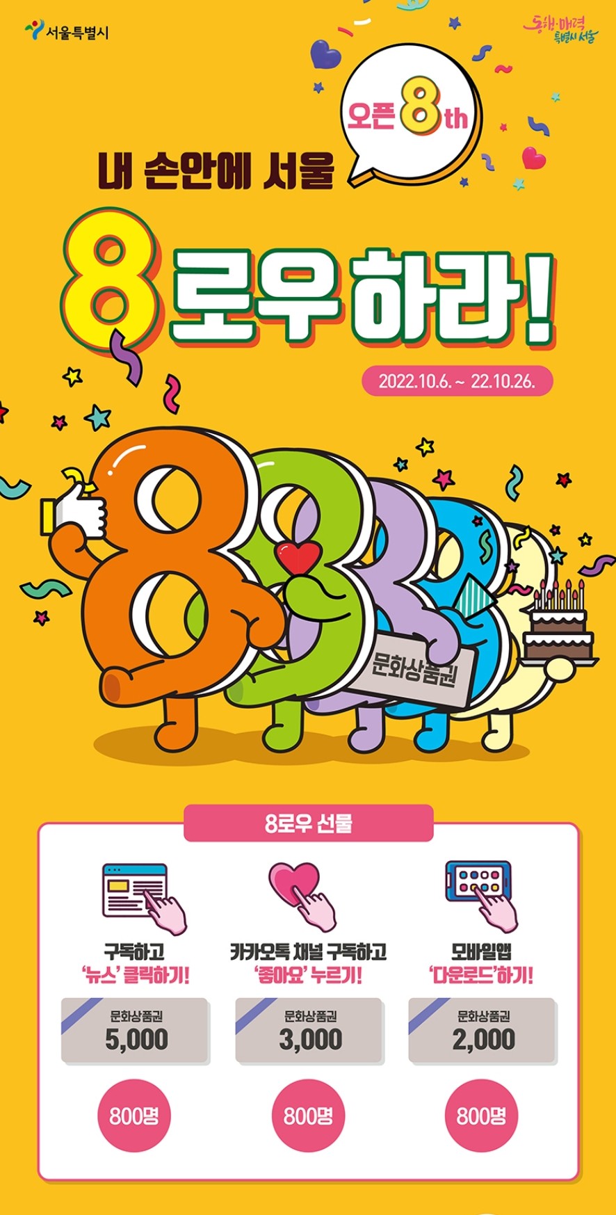 서울시 내손안의 서울에서는 오픈 8주년 이벤트를 시행중이다. 크게 뉴스구독, 카카오톡 채널 팔로우, 모바일앱 다운 인증 이벤트로 나뉜다.