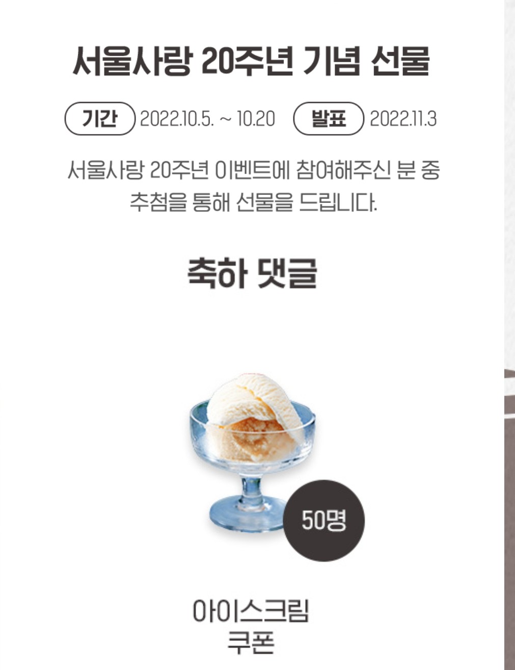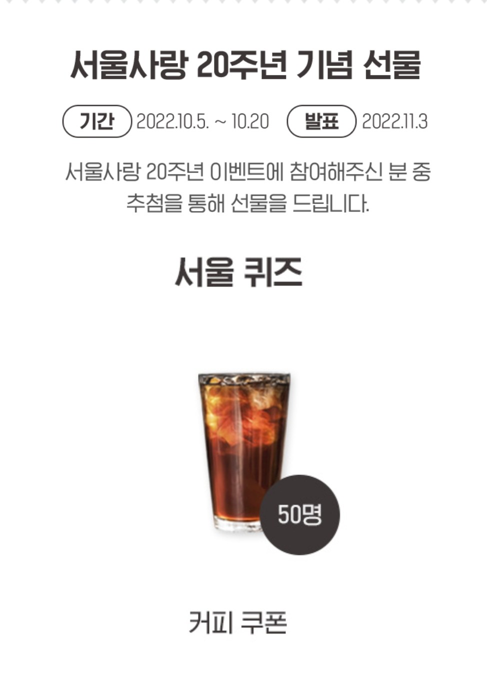서울사랑 20주년 이벤트 선물은 아래와 같습니다. 퀴즈선물은 아메리카노 커피쿠폰, 댓글 이벤트 아이스크림 선물, 전시회 쿠폰 등등 다양한 선물이 제공된다고 합니다.