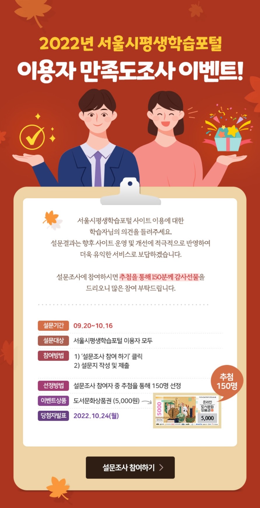 서울시 평생학습포털에서는 이용자 만족도 조사를 하고 있습니다. 총 150명에게 도서문화상품권 5천원을 지급하는 이벤트입니다.
