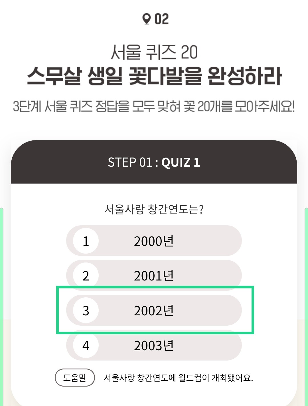 퀴즈 이벤트입니다. 3단계 퀴즈를 모두 맞혀 꽃 20개를 모으시면 됩니다.