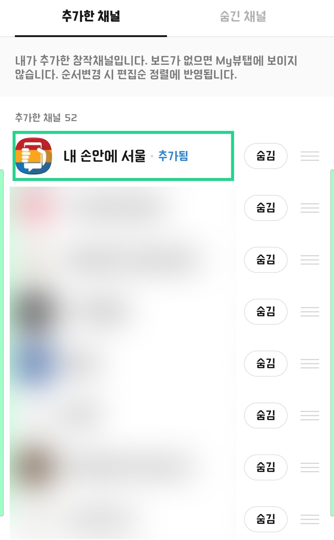 아래와 같이 내 손안에 서울 채널을 추가하신 다음