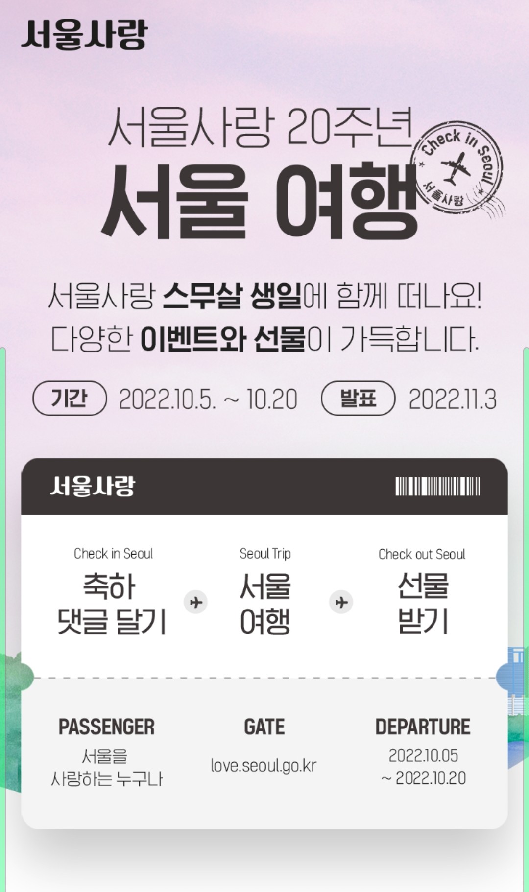 아래는 서울사랑 창간 20주년 기념으로 나온 이벤트의 내용입니다. 2002년도 처음 창간된 서울 월간 소식지 서울사랑은 20주년의 창간을 맞아 서울 여행을 떠나는 컨셉의 이벤트를 열었습니다.