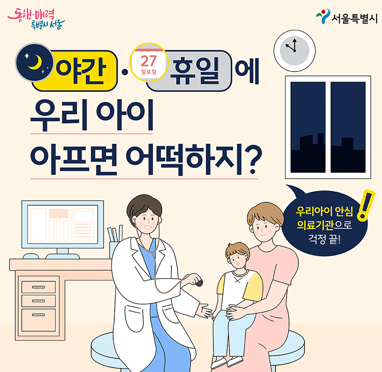 긴급하게 야간/휴일에 아이가 아플 때, 서울특별시에서 이를 위한 '우리아이 안심 의료기관'이라는 것을 운영합니다.