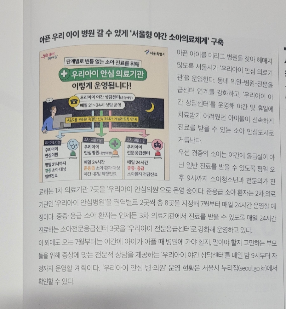 아이를 키우면서 모두 한번쯤 원인을 알 수 없는 열로 인하여 응급실을 다녀온 경험들이 있었을거라고 생각합니다. 이러한 의료 공백 없는 정책이 서울시에 거주하는 시민들을 안심하고 아이를 키울 수 있게 하는 하나의 요인이라고 봅니다. 위의 정보를 참고하여 아이를 긴급상황에 잘 케어할 수 있었으면 합니다.