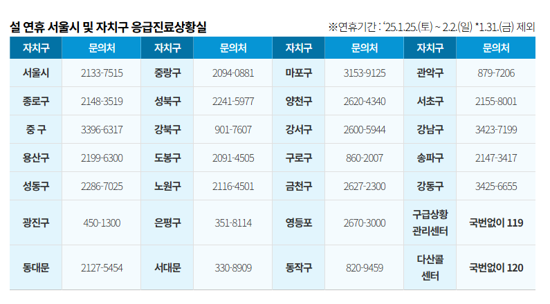 아래는 설 연휴 기간 동안 서울시 및 자치구의 응급진료상황실 전화번호입니다. 서울시 외 자치 구별 별도 응급 진료를 받을 수 있는 곳이 다르니 아래의 지도 및 연락처를 참고해주시면 됩니다.