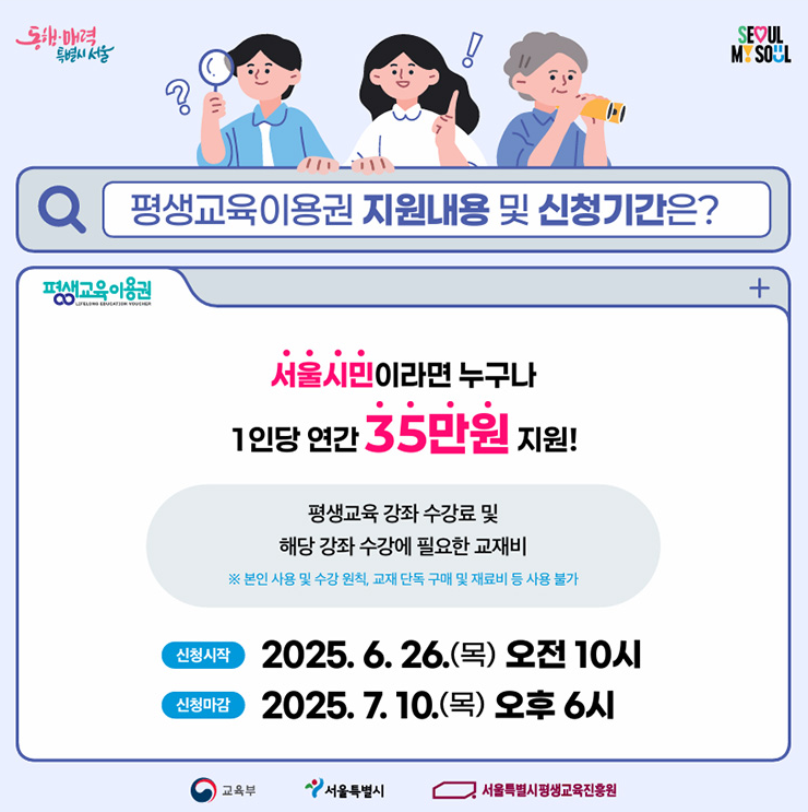 서울시의 평생교육이용권은 경제적 이유로 학습을 하지 못하는 분들에게 매우 큰 기회입니다. 소득 무관, 누구나 신청 가능하며 연간 35만원까지 받을 수 있는 배움의 기회를 놓치지 않고 반드시 잡아보시기 바랍니다. 감사합니다.