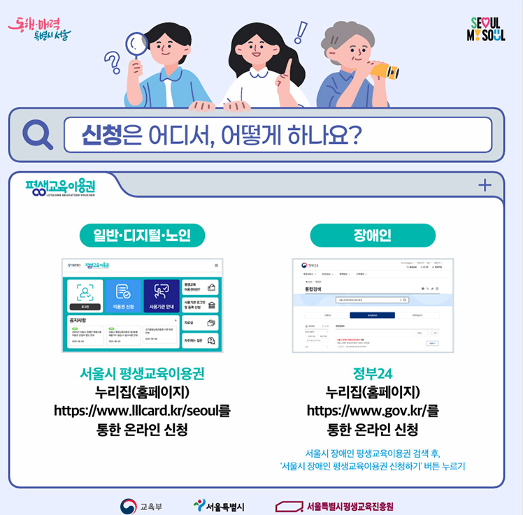 문의 : 서울시 평생교육이용권 상담센터 1551-4777, 장애인 평생교육이용권 상담센터 1668-0420