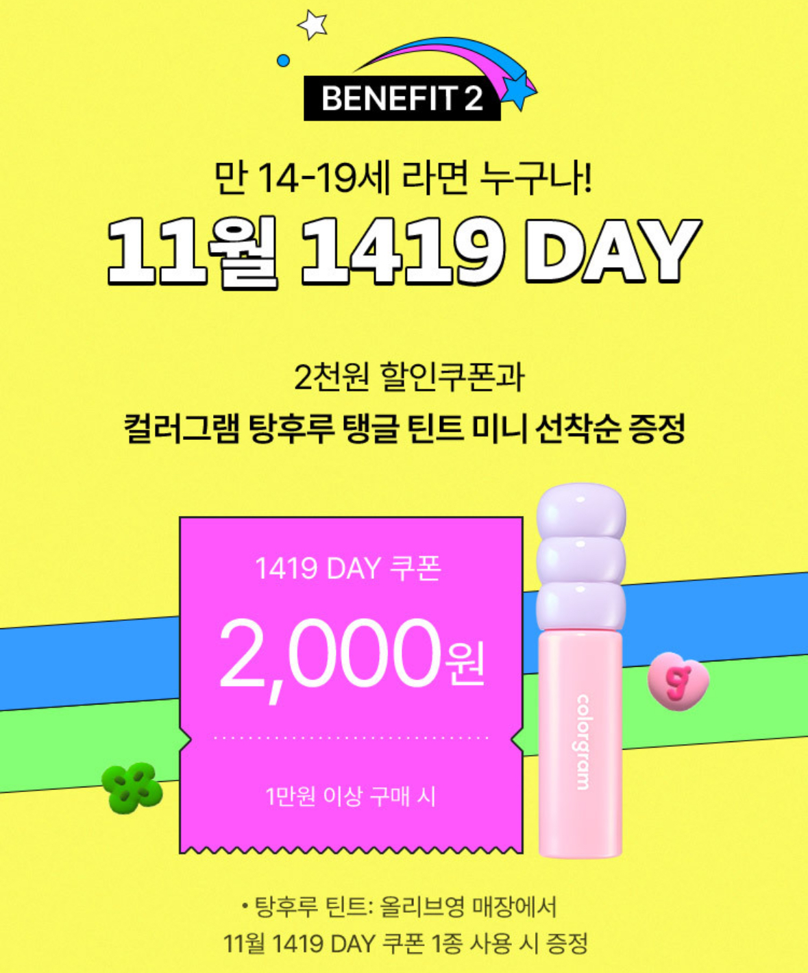 또한 만 14세~19세라면 누구나 11월 1419데이에 쿠폰을 받을 수 있습니다. 탕후루틴트 미니 증정 이벤트와 함께 2천원 할인 쿠폰이 제공됩니다.