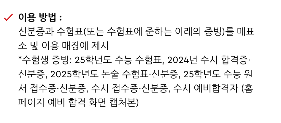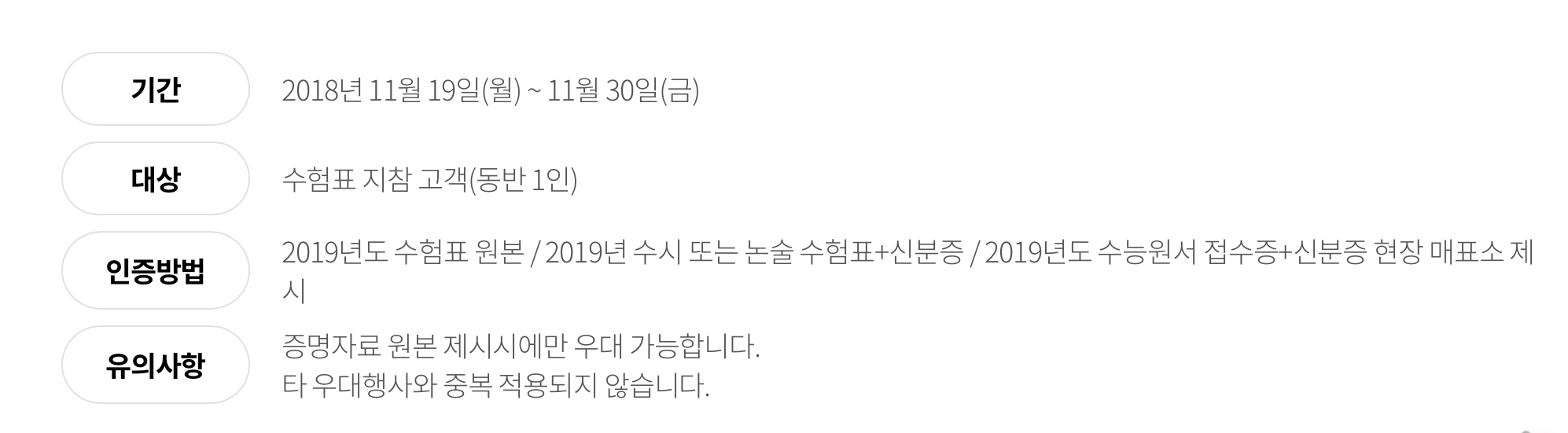 일단 길고 길었던 수험 생활을 뒤로 하고 수험표 지참으로 할인되는 이벤트 정보들을 한 곳에 전부 모아봤는데요! 오늘 포스팅을 참고하셔서 친구들과 재미난 추억을 많이 쌓으셨으면 좋겠습니다. 수험색 할인 정보 바로 들어갑니다.