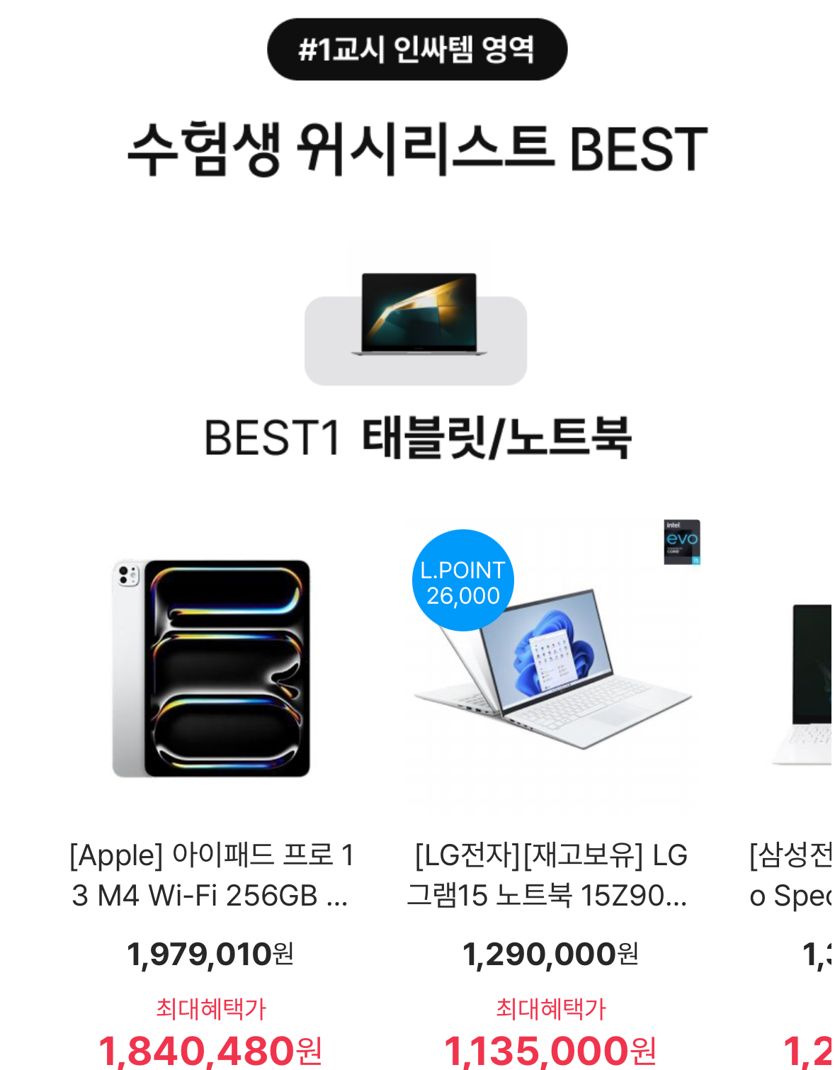 또한 수험생들의 위시리스트를 할인하고 있습니다. 애플/삼성/LG등 브랜드별,상품별 할인 혜택이 상이하니 아래의 링크로 확인해주시기 바랍니다.