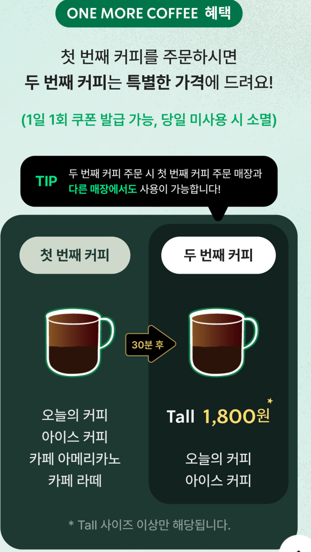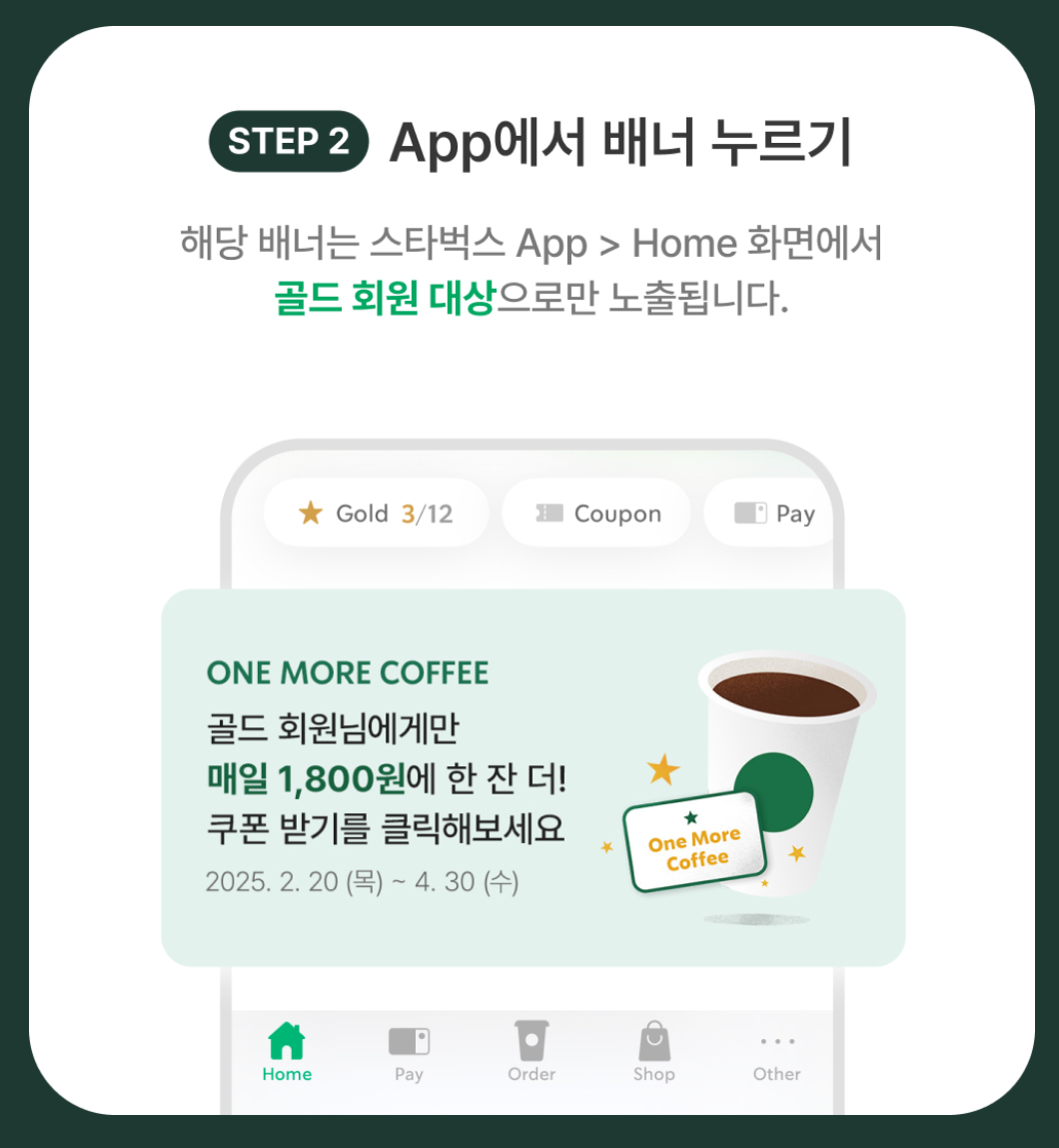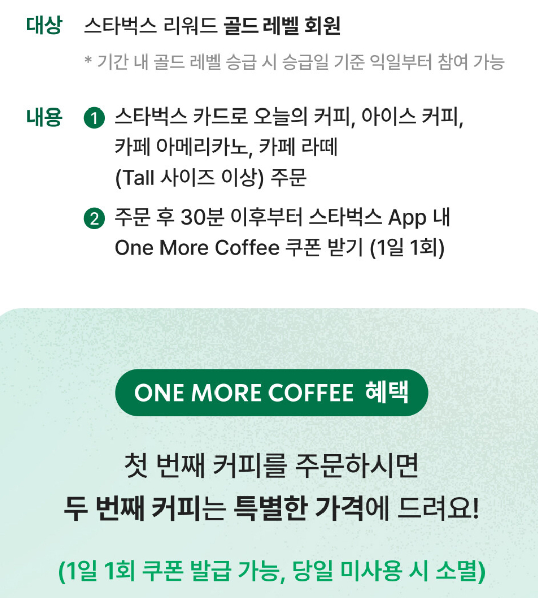 리워드 골드회원을 대상으로 스타벅스카드로 오늘의 커피, 아이스커피, 카페 아메리카노, 카페라떼 톨사이즈 이상을 주문하는 경우 주문 후 30분 이내 One More Coffee 쿠폰을 발급받을 수 있습니다(1일 1회)