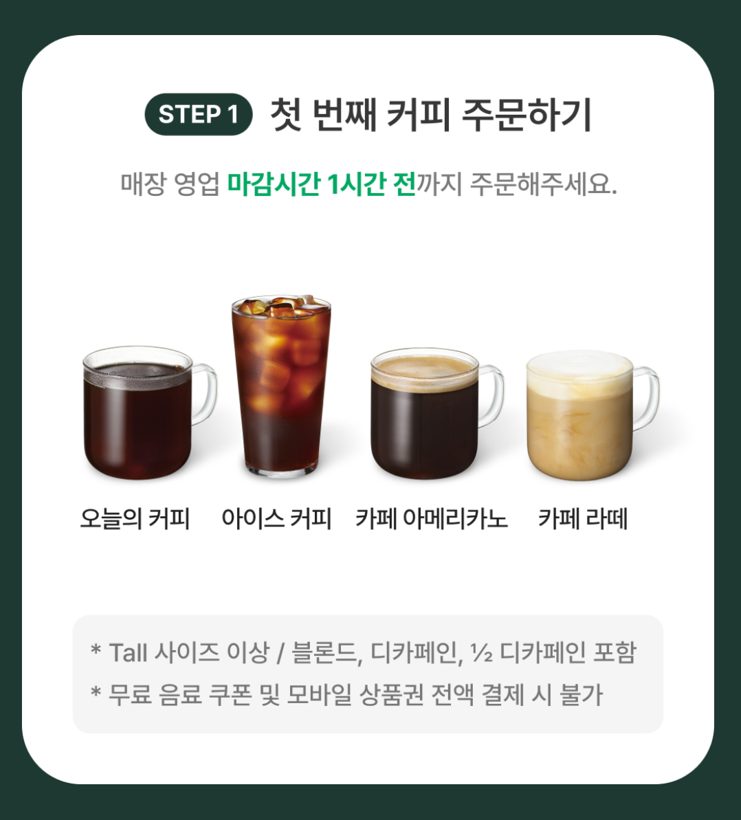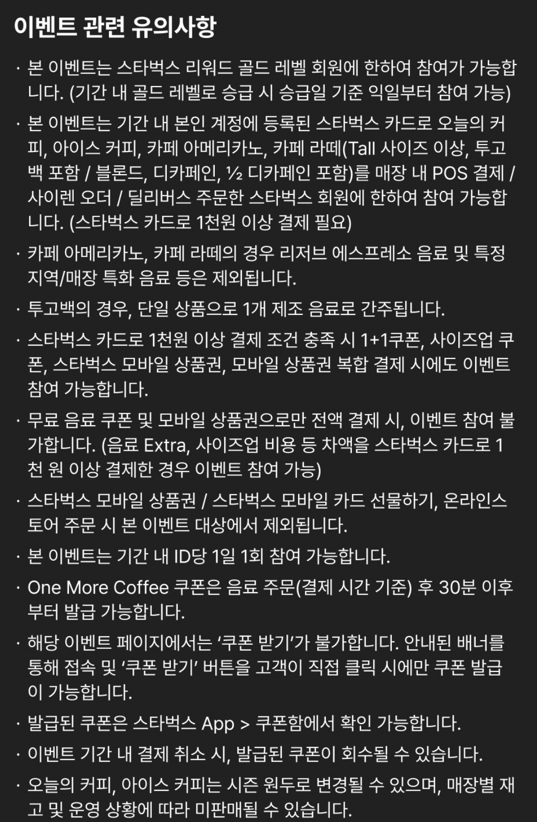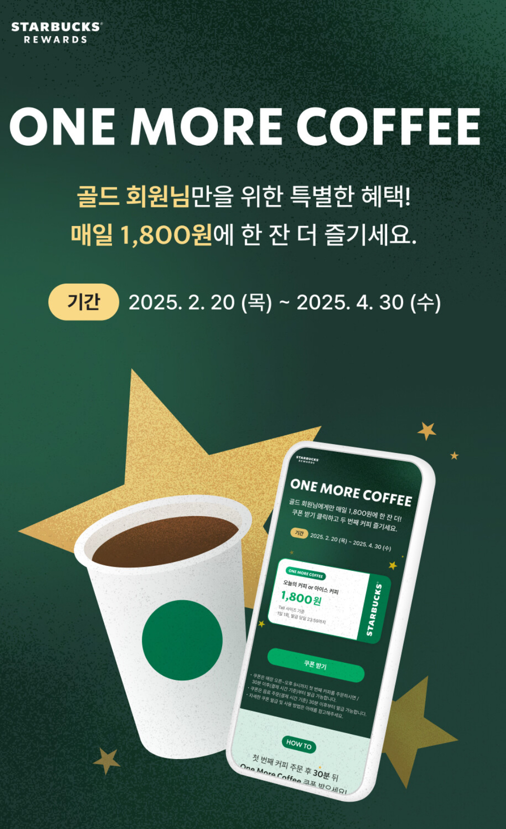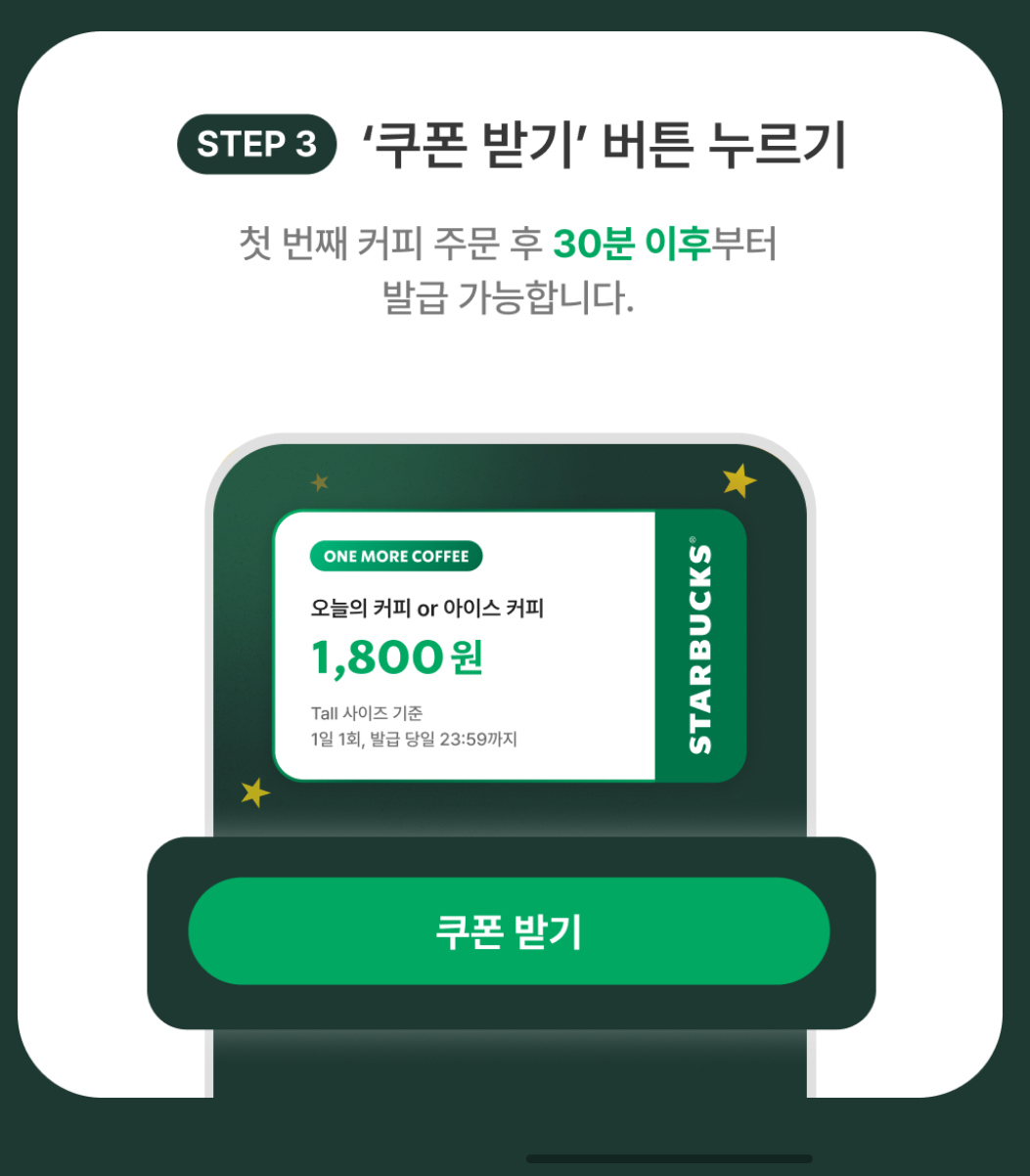 리워드 골드회원을 대상으로 스타벅스카드로 오늘의 커피, 아이스커피, 카페 아메리카노, 카페라떼 톨사이즈 이상을 주문하는 경우 주문 후 30분 이내 One More Coffee 쿠폰을 발급받을 수 있습니다(1일 1회)