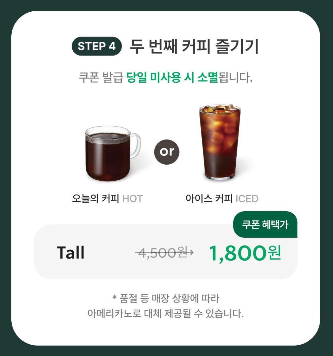 첫 번째 커피로 받은 원모어쿠폰을 사용하면 두 번째 커피는 1,800원에 구입하실 수 있습니다.