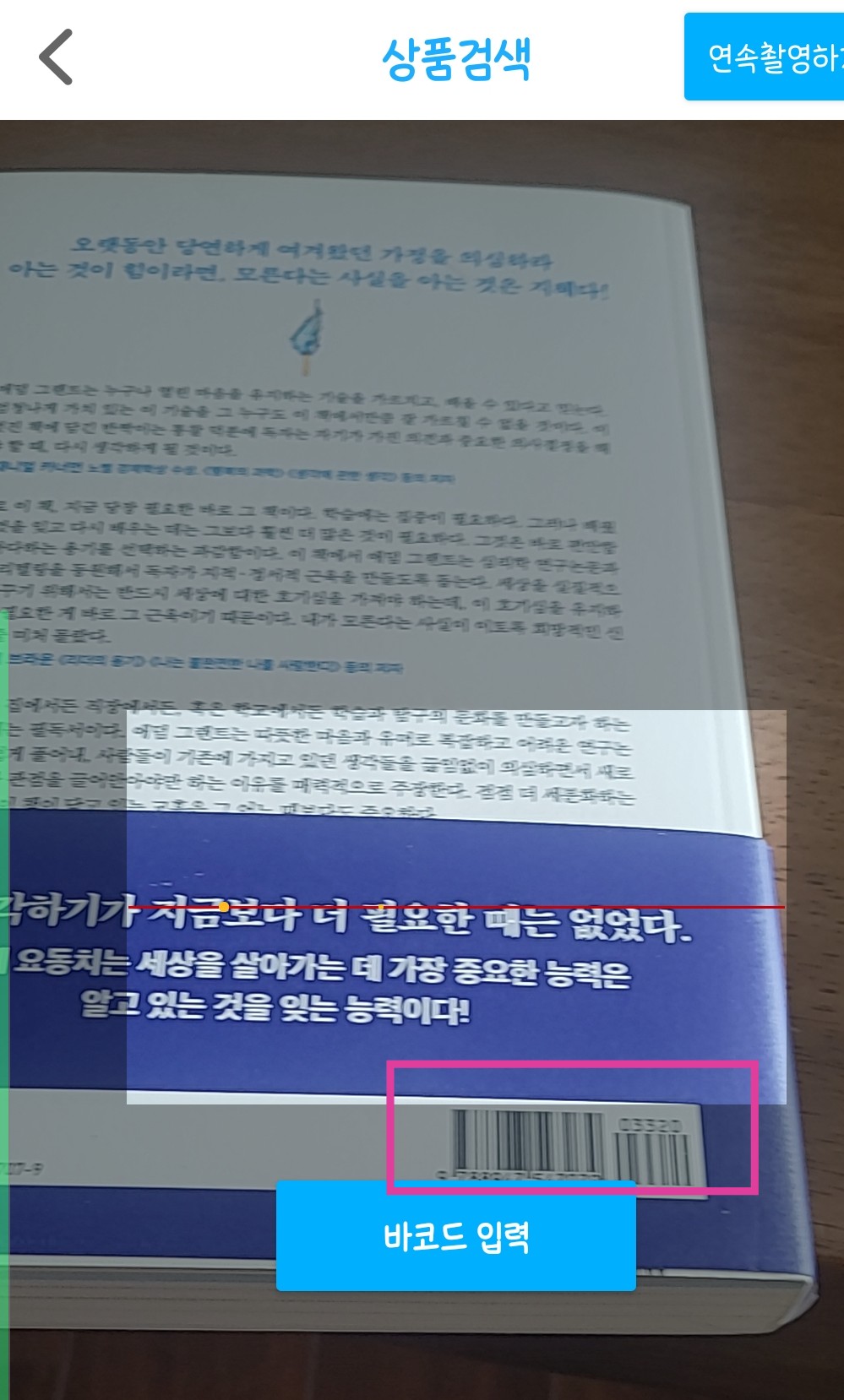상품 검색을 위한 바코드 인식 카메라 화면이 뜹니다. 카메라의 틀에 맞게 책의 바코드를 찍으면 해당 책의 정보를 자동으로 조회할 수 있습니다.