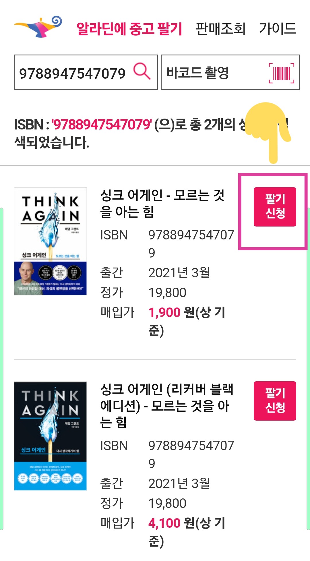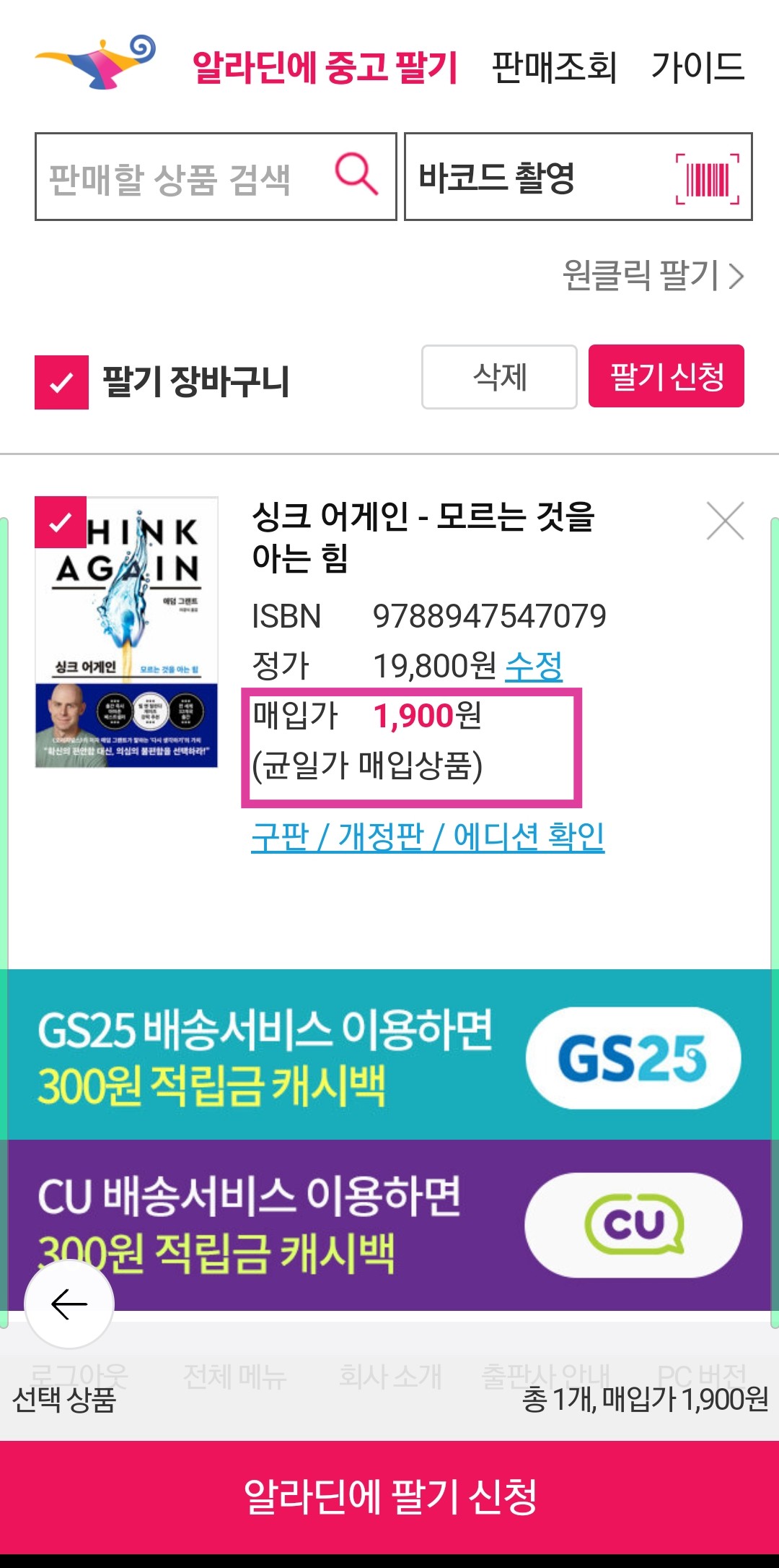제가 팔고 싶은 상품은 think again으로 균일가 매입상품입니다. 상품의 컨디션과 상관없이 무조건 같은 가격으로 매입을 진행한다는 의미라 꽤 오래된 책도 균일가로 팔면 쏠쏠하게 받을 수 있습니다.