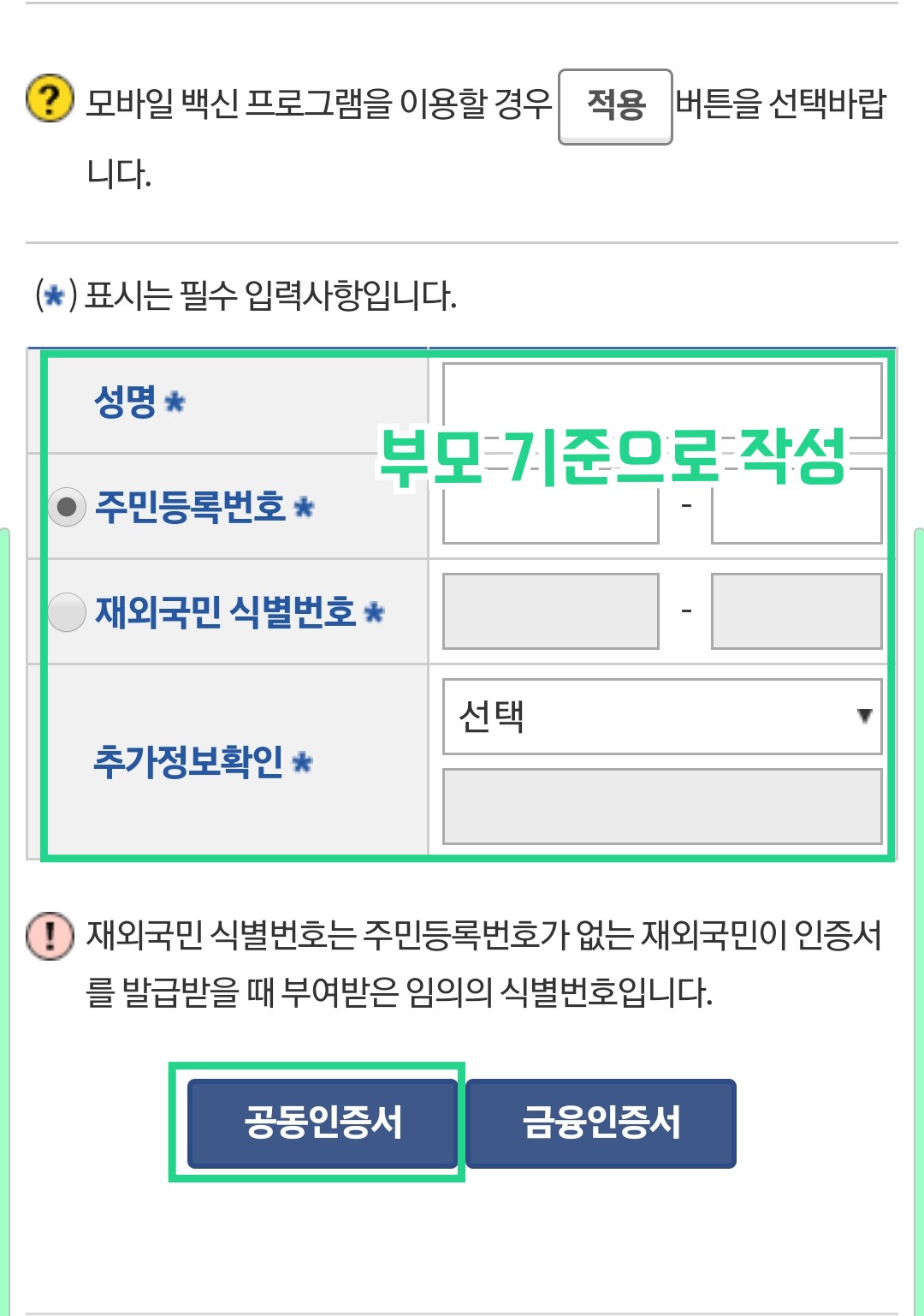자녀는 아직 공동인증서가 없으므로 자녀의 공동인증서가 없는 경우 인증을 부모 것으로 하고 들어가면 됩니다.