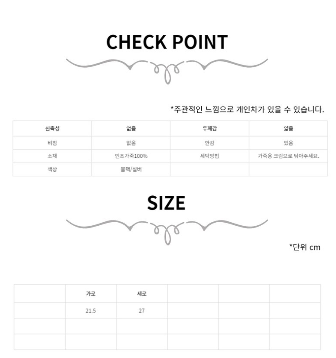 소재는 인조가죽(비건레더)이고 안감은 있으며 색상은 네 가지입니다. 크기와 소재에 대해 궁금하신 분들이라면 아래의 상세 스펙을 참고하시기 바랍니다.