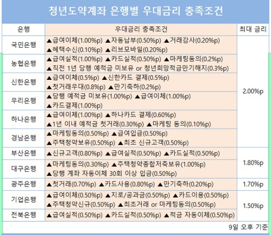 아래는 청년도약계좌의 은행별 우대금리 충족조건입니다. 대부분 급여나 자동이체, 카드사용 등을 조건으로 내거는 것을 알 수 있습니다. 가장 간단한 것은 광주은행입니다. 광주은행은 첫 거래 고객인 경우 0.7%를 제공하고 카드를 사용하면 0.8%를 제공합니다. 본인의 주거래 은행(급여를 받는 은행 등)이 있으시다면 그 은행에서 혜택을 추가적으로 충족해서 금리를 높게 받으시는 것이 가장 편리할 수 있습니다.