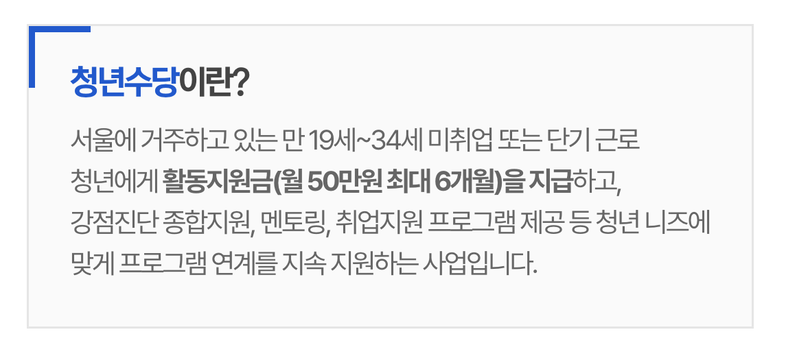 우선 청년수당이 무엇인지에 대해 알아보겠습니다. 청년수당이란 서울에 거주중인 만 19세~34세 미취업, 단기근로 청년들에게 월 50만원 수당을 지급하는 것으로 청년들의 취업 및 자립을 돕는 서울시의 청년 프로젝트입니다.