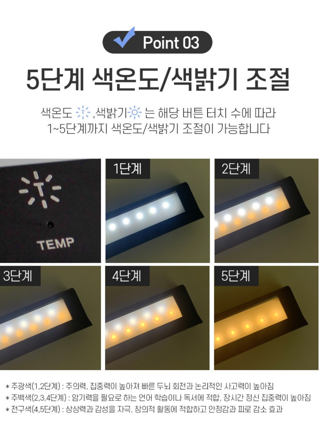색의 단계 조절도 굉장히 섬세합니다. 색의 온도, 색의 밝기는 1~5단계까지 설정 가능하며 주광색, 주백색 두 가지 타입으로 선택할 수 있기 떄문에 원하는 니즈에 맞게 설정하면 됩니다. 또한 사용 후 다시 켰을 때 마지막 상태가 저장되어 반복적인 설정 없이도 바로 데일리로 사용하기 편리합니다.