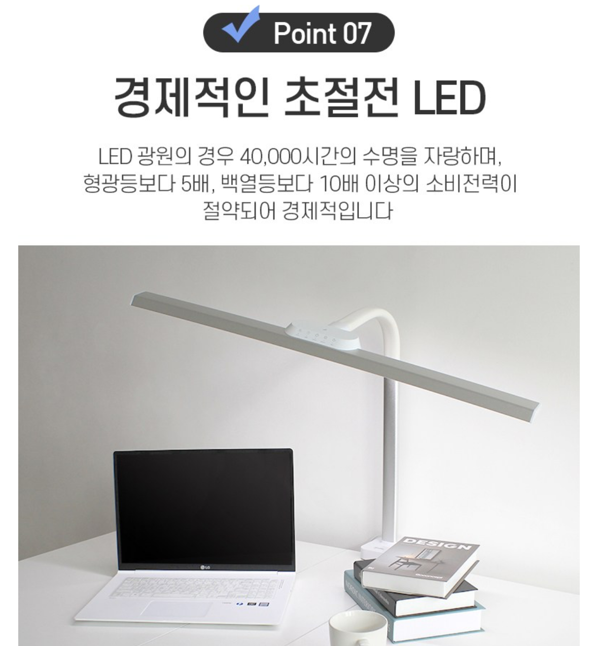 경제적인 측면도 고려하지 않을 수 없습니다. LED광원의 경우 4만 시간동안 사용이 가능하며 10배 이상의 소비전력의 절감 효과를 얻을 수 있다는 점도 장점이었습니다. 게다가 눈에 보이는 깜빡임이 없는 플리터 프리(Flicker Free)기술을 도입하여 형광등 조명 대비 근시로의 진행을 막아주는 데에 도움이 됩니다.