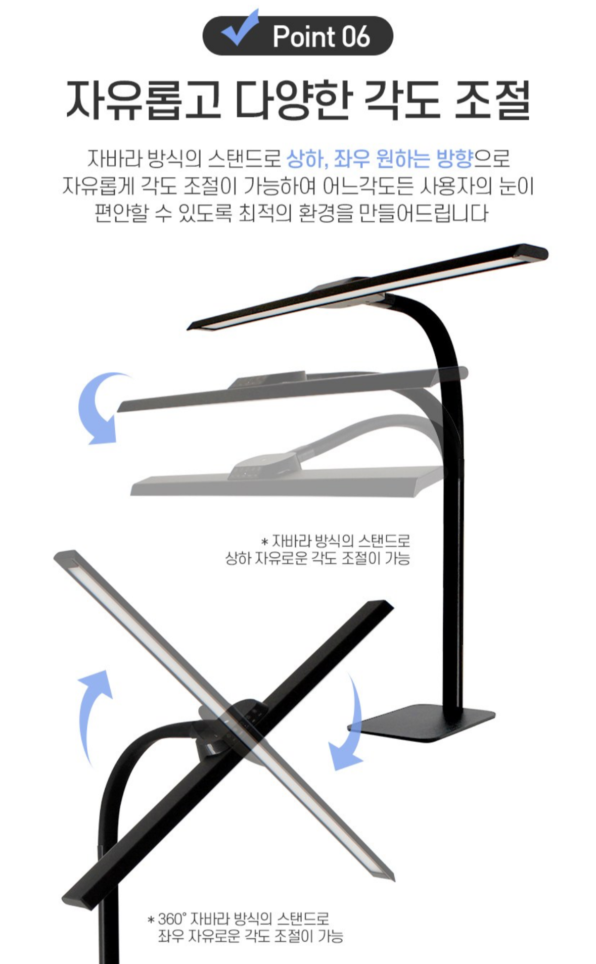 우선 테드 LED 와이드 스탠드는 각도조절이 자유롭고 전체를 고르게 밝혀주기 때문에 눈의 피로감이 덜합니다. 게다가 밝기 자동감지 센서도 있어서 상당히 편한 측면도 있습니다. 타이머 등의 기능도 있고 플리커-프리 기술이 적용되어 있어 깜빡임이 없습니다.