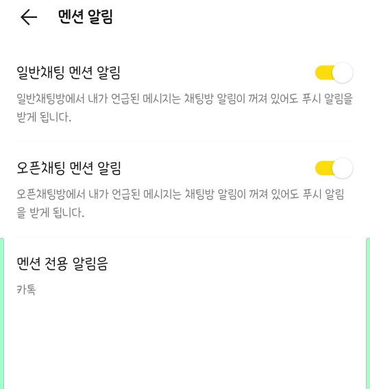 멘션 알림 메뉴에 들어오면 일반채팅 멘션 알림, 오픈채팅 멘션 알림이 있습니다. 멘션에 대해 언급하고 싶지 않거나 알림을 받고 싶지 않은 경우라면 두 개의 멘션에 대해 모두 끄기를 누르면 됩니다. 만약 광고가 난무하는 오픈채팅의 멘션만 끄고 싶다면 오픈채팅의 멘션만 끌 수도 있습니다.